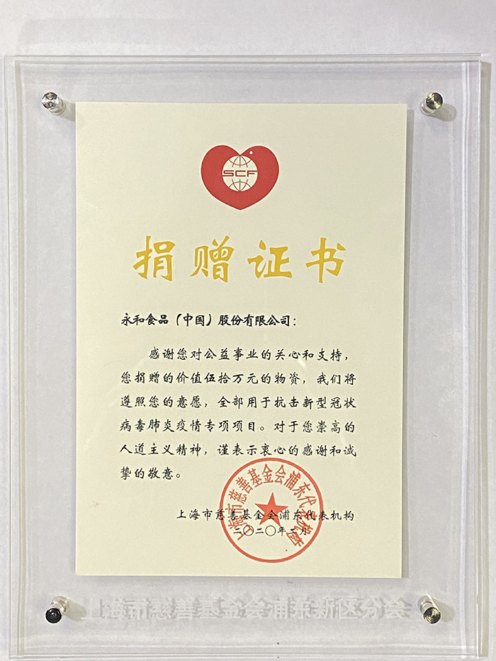 捐贈(zèng)儀式在浦東新區(qū)政府行政辦公中心舉辦,浦東新區(qū)區(qū)委常委、統(tǒng)戰(zhàn)部部長(zhǎng)金梅,浦東新區(qū)副區(qū)長(zhǎng)徐惠麗等領(lǐng)導(dǎo)出席儀式。永和食品(中國(guó))股份有限公司董事長(zhǎng)林建雄特派瞿江琴副總經(jīng)理作為企業(yè)代表組織捐贈(zèng)并接受了上海市慈善基金會(huì)頒發(fā)的捐贈(zèng)證書和感謝信。