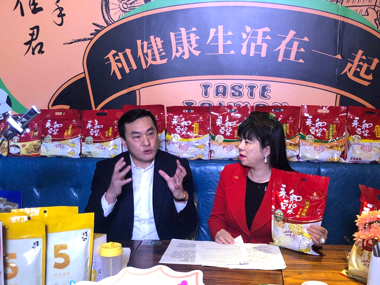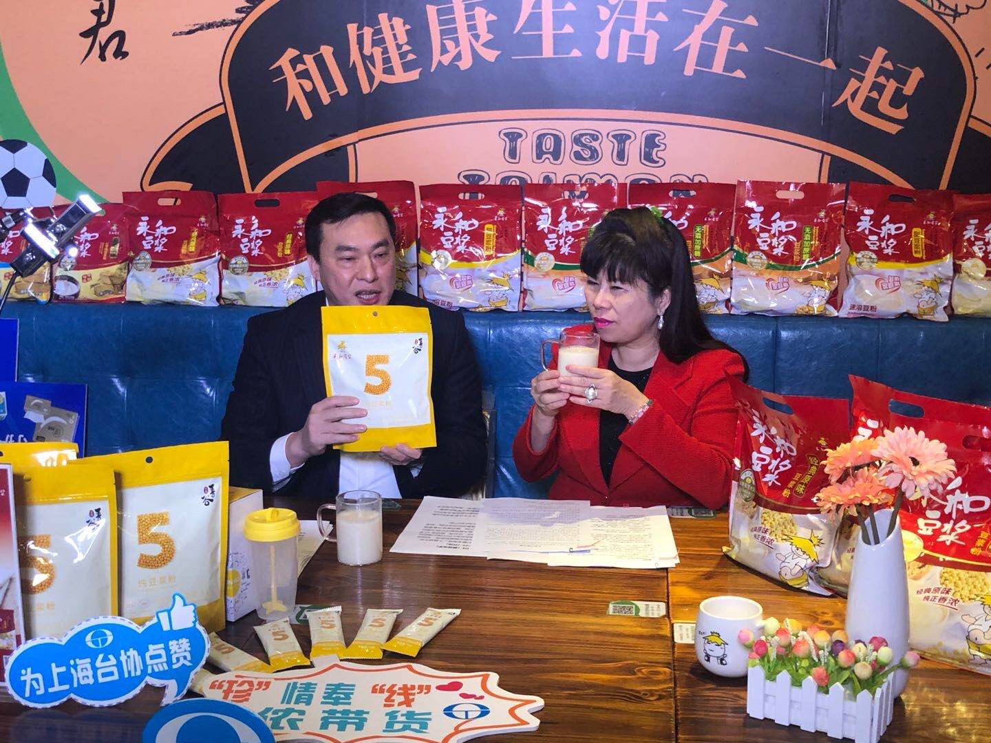 本次直播選址上海浦東南泉北路400號的永和豆?jié){世紀店,永和豆?jié){林建雄董事長親臨門店直播現(xiàn)場,和臺協(xié)張簡珍會長一起化身直播達人,為大家?guī)砹酥辈ベ徫锔@?,同時通過永和豆?jié){旗下的兩款熱銷產(chǎn)品:510g經(jīng)典原味豆?jié){粉、180g吾谷純豆?jié){粉向觀眾展示了永和豆?jié){專注豆?jié){領(lǐng)域38年的企業(yè)實力。