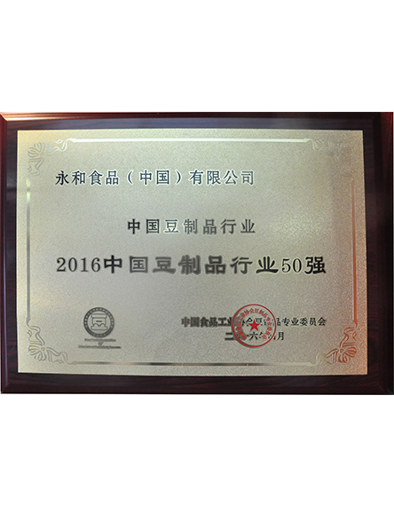 20164 月永和食品(中國)有限公司榮獲2016中國豆制品行業(yè)50強 -