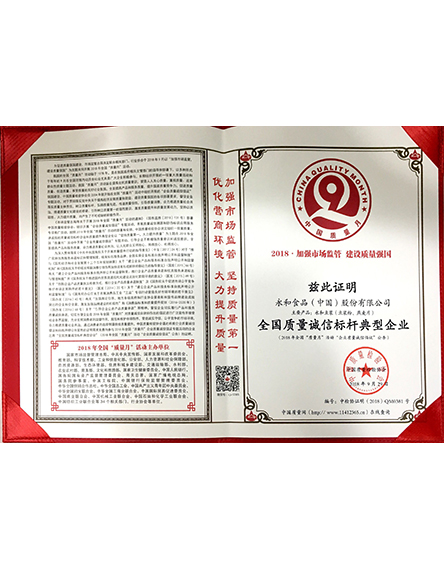 20189 月永和食品(中國)股份有限公司榮獲2018全國質(zhì)量誠信標桿典型企業(yè) -
