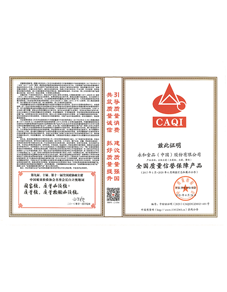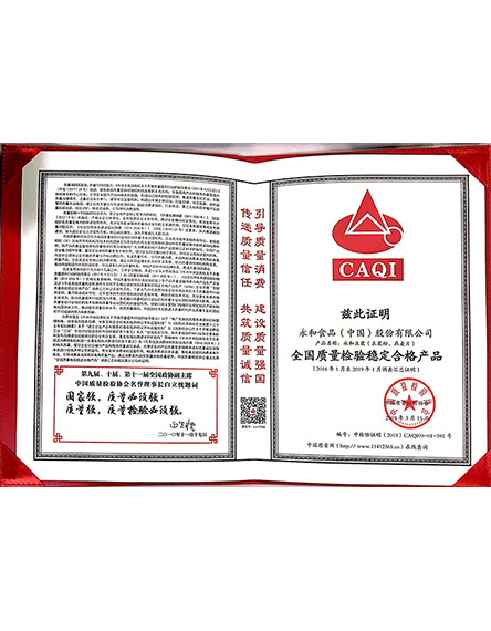 20193 月永和食品(中國)股份有限公司產(chǎn)品榮獲全國質(zhì)量穩(wěn)定檢驗合格產(chǎn)品 -