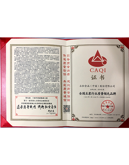 20186 月永和食品(中國)股份有限公司旗下品牌永和豆?jié){榮獲全國豆?jié){行業(yè)質(zhì)量領(lǐng)先品牌 -