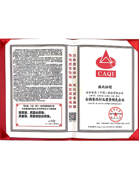 20198 月永和食品(中國)股份有限公司榮獲2019全國食品行業(yè)質(zhì)量領(lǐng)先企業(yè) -