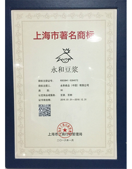 20161 月永和豆?jié){榮獲上海市著名商標