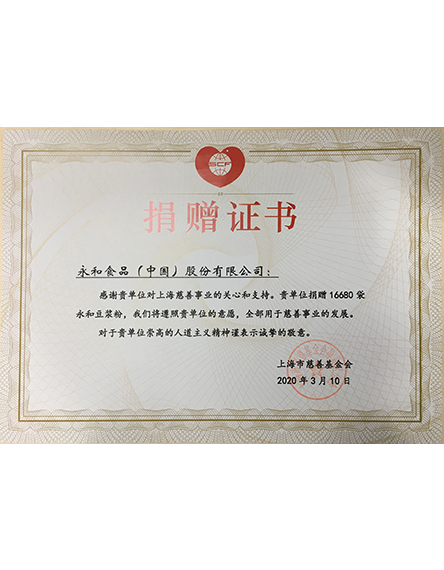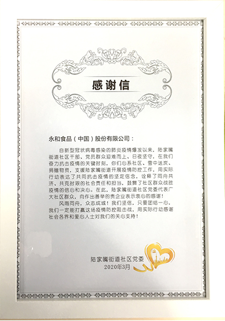 20205 月自2020疫情爆發(fā)以來,永和食品(中國)股份有限公司積極承擔企業(yè)責任,深度參與靜安區(qū)慈善愛心捐贈活動,將愛心傳遞,為健康續(xù)航!上海市靜安區(qū)外商投資企業(yè)協(xié)會為此頒發(fā)感謝狀! -