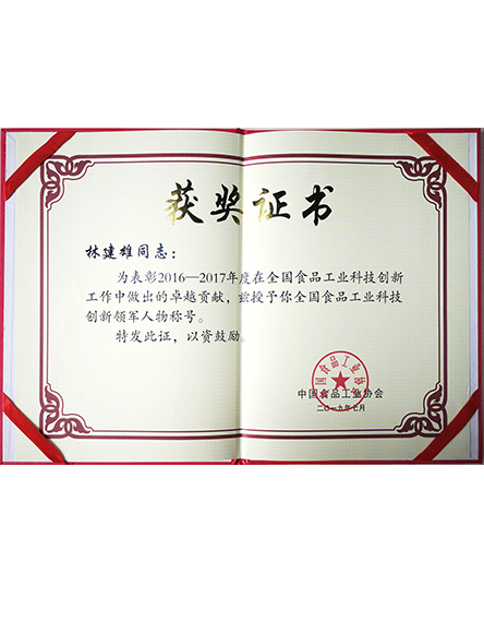 20197 月為表彰林建雄2016-2017年度在全國食品工業(yè)科技創(chuàng)新工作中做出的貢獻,中國食品工業(yè)協(xié)會授予林建雄榮譽稱號和證書 -