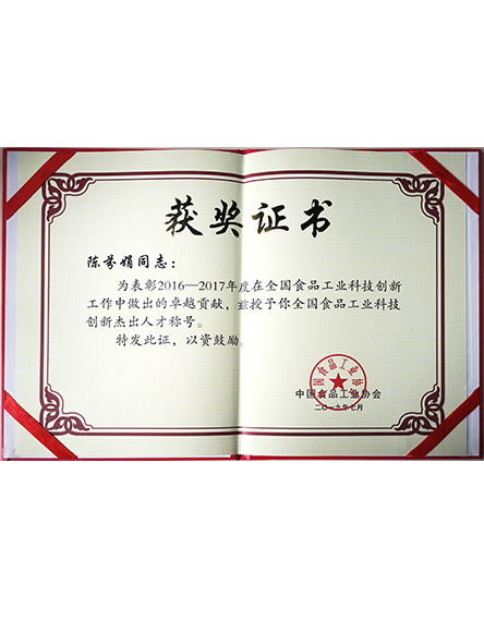 20197 月為表彰陳芬娟2016-2017年度在全國食品工業(yè)科技創(chuàng)新工作中做出的貢獻,中國食品工業(yè)協(xié)會授予陳芬娟榮譽稱號和證書 -