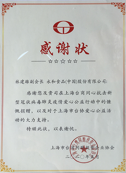 20205 月永和食品(中國)股份有限公司董事長、上海市臺協(xié)副會長林建雄在上海臺商同心抗擊新冠疫情愛心公益行動中慷慨捐贈,被上海臺協(xié)授予感謝狀! -