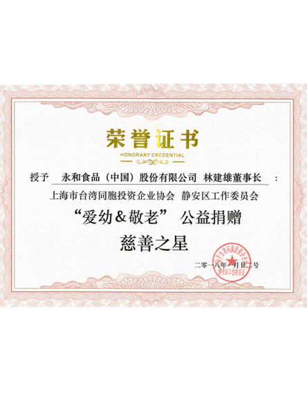 20181 月上海市臺灣同胞投資企業(yè)協(xié)會靜安區(qū)工作委員會授予永和食品(中國)股份有限公司林建雄董事長愛幼&敬老”公益捐贈慈善之星榮譽證書 -