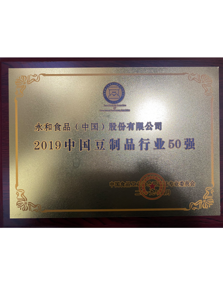 20194 月永和食品(中國)股份有限公司榮獲2019中國豆制品行業(yè)50強 -