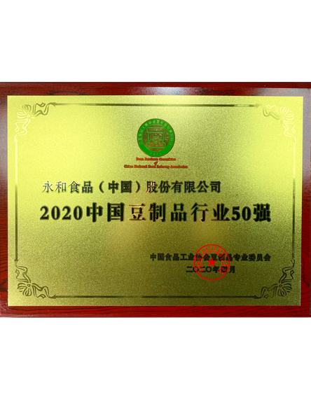 20204 月永和食品(中國)股份有限公司榮獲2020中國豆制品行業(yè)50強 -