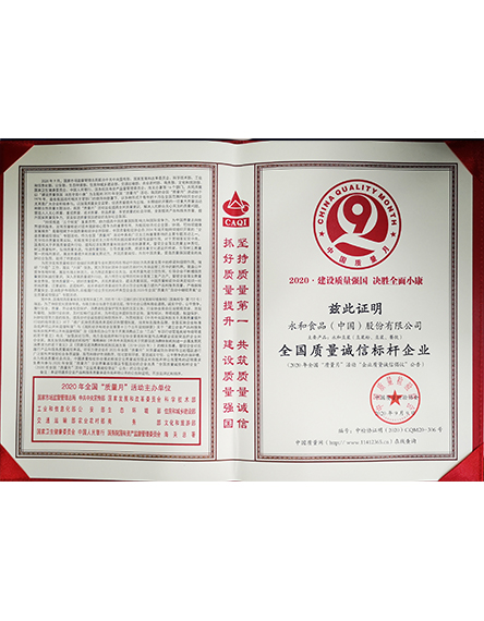 20209 月永和食品(中國)股份有限公司榮獲全國質(zhì)量誠信標桿企業(yè)稱號 -