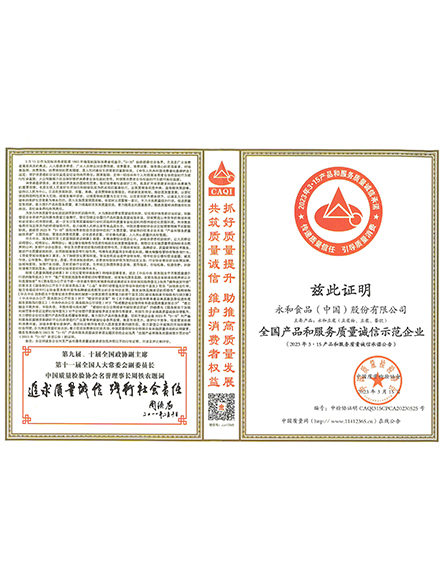 20243 月永和食品(中國)股份有限公司榮獲全國產(chǎn)品和服務質(zhì)量誠信示范企業(yè) -
