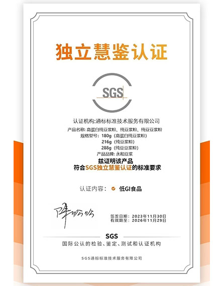 202311 月永和豆?jié){純豆?jié){粉通過SGS獨立慧鑒低GI食品認證 -