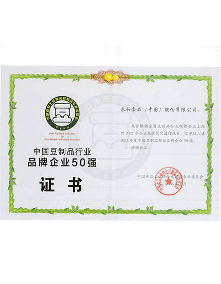 20235 月永和食品(中國)股份有限公司榮獲中國豆制品行業(yè)品牌企業(yè)50強 -